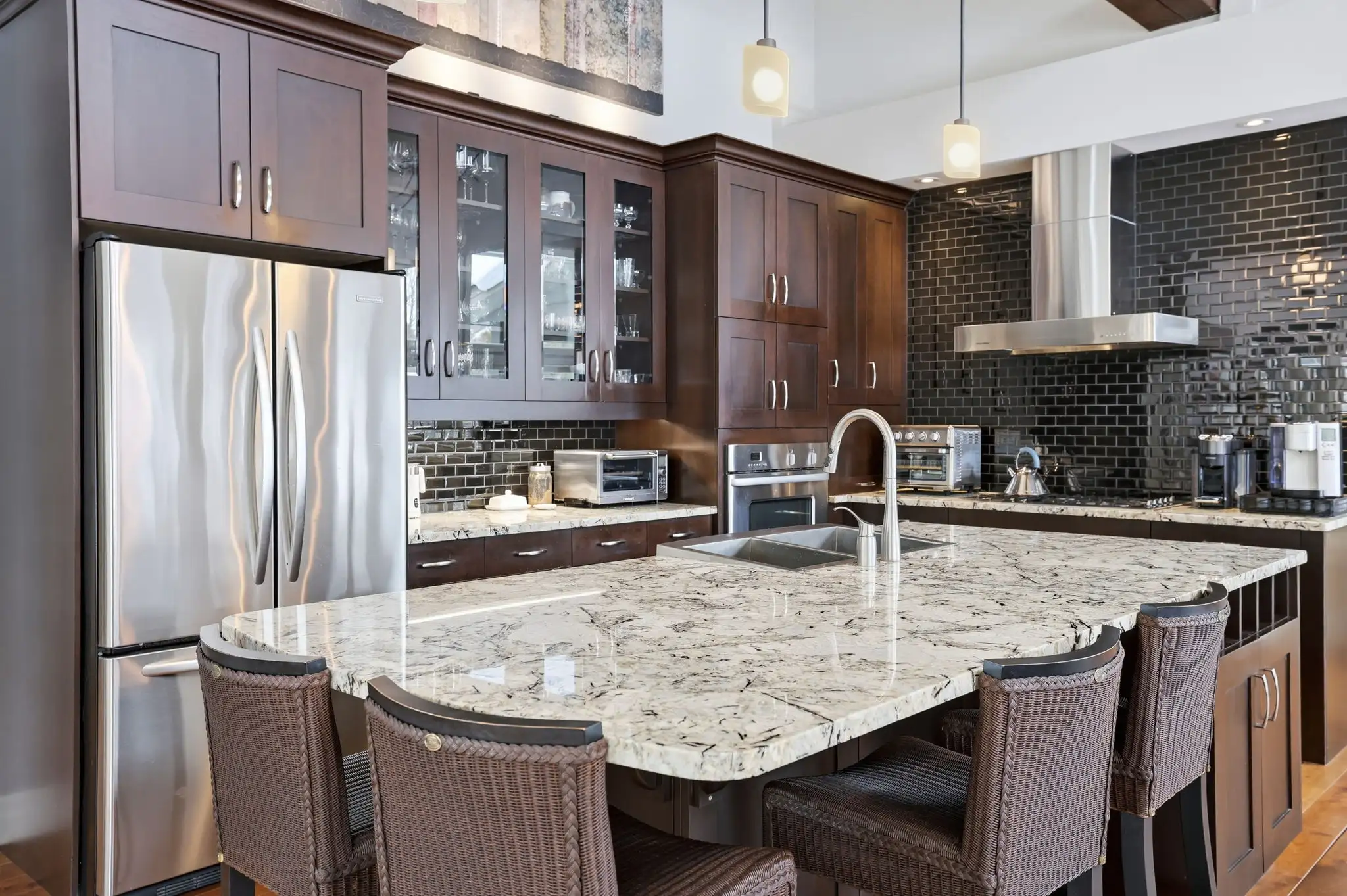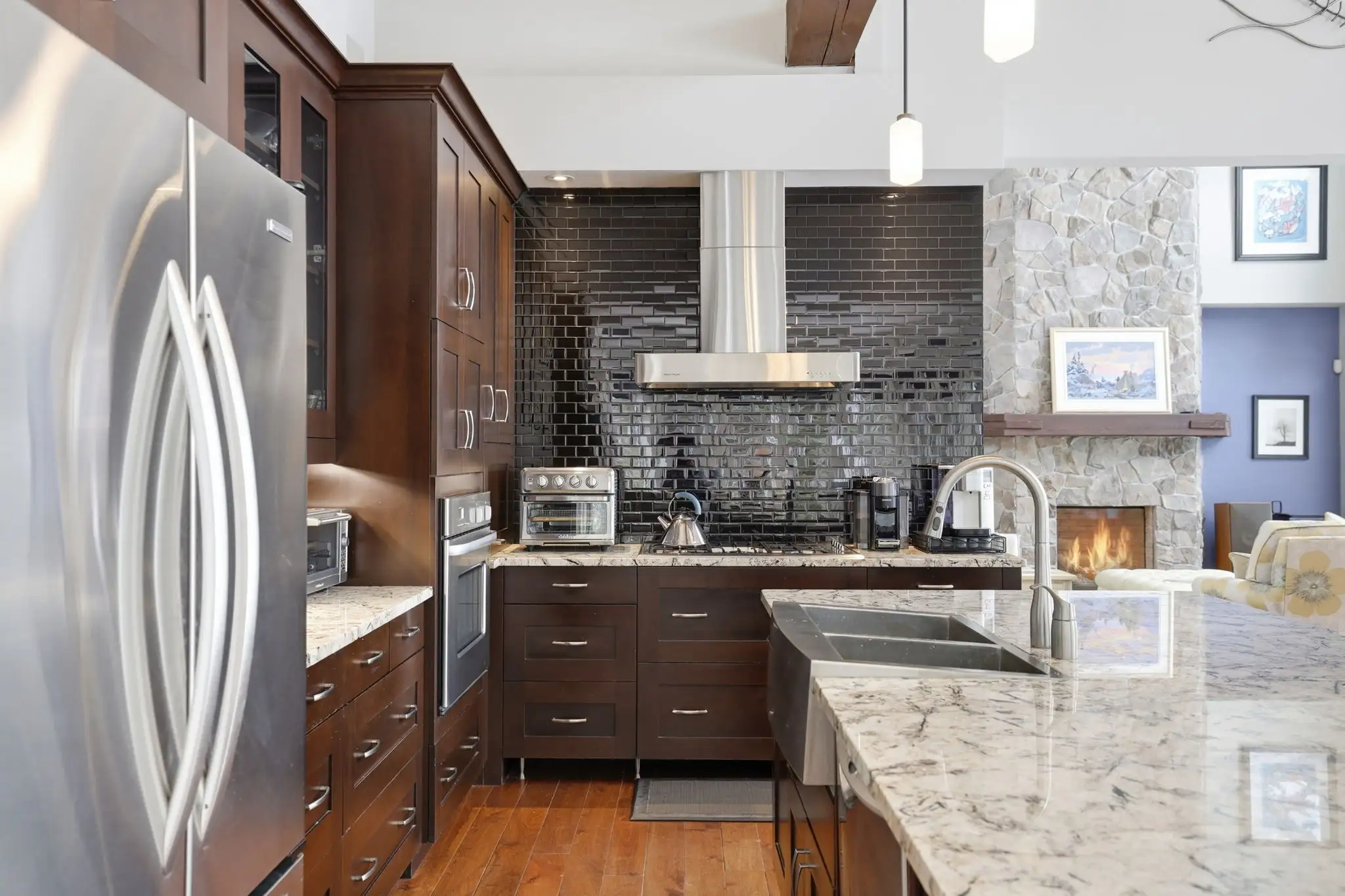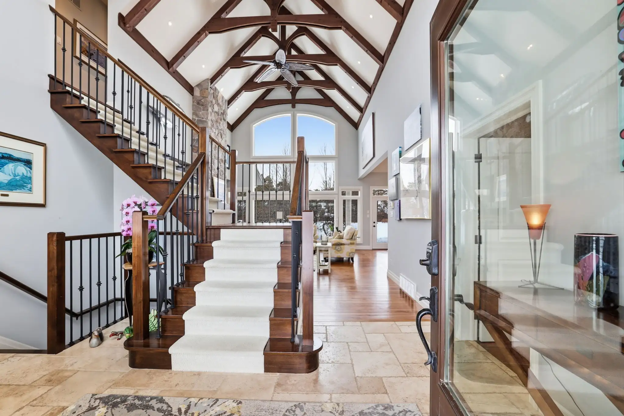 The main level features an open, light-filled layout with soaring ceilings and elegant finishes, creating a warm and inviting atmosphere ideal for both everyday living and entertaining. The kitchen anchors the space with a large island and effortless flow into the dining and living areas. A private office, practical laundry/mudroom, and a spacious primary suite with a walk-in closet and spa-inspired ensuite complete the main floor.