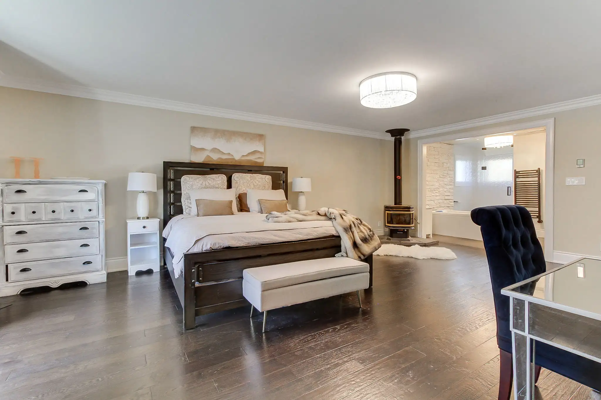 Upstairs, four spacious bedrooms, a home office, and a play area nook share a fully renovated 5-piece bathroom. The primary suite is a luxurious retreat featuring a spa-inspired 7-piece ensuite with steam shower and freestanding tub, a fireplace, an oversized walk-in closet with custom storage, and a private balcony overlooking the yard.